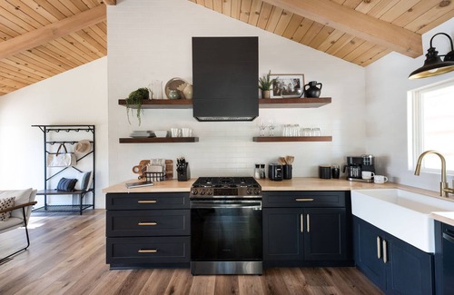 Our intimate living room and kitchen are cozy at every turn. Relax on our green velvet sofa, or take your pick among white armchairs and tufted leather benches. A huge picture window brings in an abundance of natural light. And French doors swing open to the deck, blurring the line between outdoors and in. As night falls, our wood-burning fireplace gives off a soft, romantic glow. Put on a movie or play a game from our collection – we have Uno, Scrabble, Cards Against Humanity and more. And yes! Fix yourself a cocktail at the bar cart (it’s BYO alcohol) as you settle in for another memorable evening.