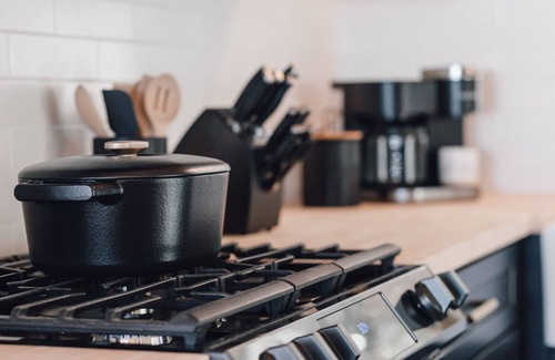 The hallway bathroom has striking matte black fixtures, from the sink and mirror to the glass-enclosed shower. There’s also a soaking tub so you can relax your muscles after a day of adventuring. Leave the following toiletries at home as we provide them in a lavender-peppermint scent: Shampoo, conditioner, shower gel, body bar soap, lotion and hand/facial soap.