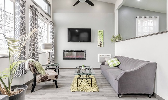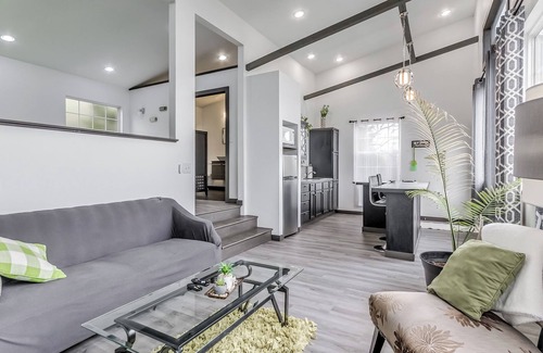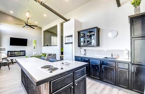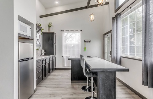 Six hundred square feet of luxury, privacy and beauty awaits you. An entire wall of windows captures surrounding nature, sparkling lake waters, and your unique sunset. Open concept floor plan combining the kitchen and living space, with a step up bedroom and bathroom. Living room hosts a full size couch, modern wall fireplace and 55 inch smart TV. Keep connected with free WIFI. Kitchen equipped for cooking includes a grand island with bar height seating. The king bed and jacuzzi tub are just steps above the living area, allowing unobstructed views of the lake. The private bathroom completes the top tier with full shower and modern floating vanity. Comfort is definite any season with AC/Heat unit, ceiling fan and modern wall electric fireplace. The patio extending out the front offers outdoor seating as well as a grill to prepare your BBQ favorites (propane included). A private fire ring allows you to enhance your lake visit and host your own campfire, complete with firewood and chairs. Tucked back and elevated in the trees, privacy for one couple awaits in this modern unit. Escape your hectic days,and relax and rejuvenate in this captivating spa themed unit. Feel a sense of security with storm shelter on site and gated entrance.