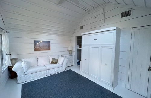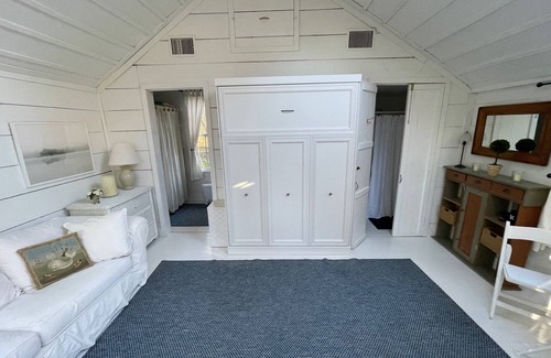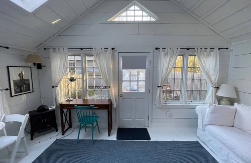 A romantic hideaway in Sag Harbor's historic district, within easy walking distance of Main Street. This sweet studio guesthouse is perfect for two, with its own private entrance. In addition to the studio living space, it features a well-stocked kitchenette, full bathroom (shower only), cozy electric fireplace, and comfy queen-size Murphy bed. Free WiFi included.