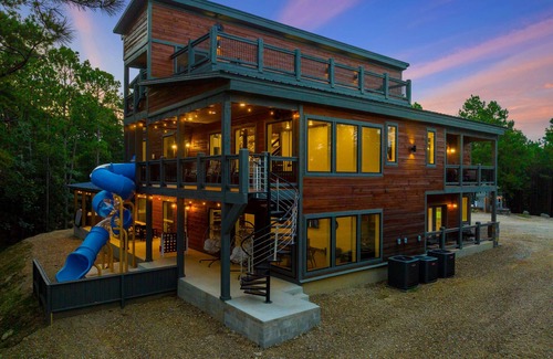 Rooftop Patio Fun New Luxury Cabin with Pool, Indoor 3-Story Slide, Pet Friendly | Cabin in Broken Bow