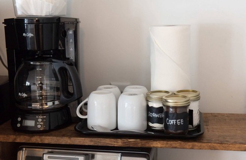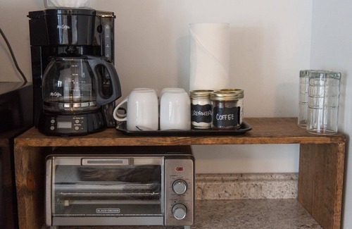 Room 1 at Inland in a Studio-Style with 2 Queen Beds. A small table and chairs provide the perfect laptop work space. This room has a hot plate, microwave oven and toaster oven for limited cooking. Cookware, dishes, silverware and some limited utensils are provided. The room also has a coffee pot, coffee, creamer and sugar are included. A small refrigerator/freezer is available for use. A tub/shower combo complete this room nicely. Perfect for limited or long-term rental.
