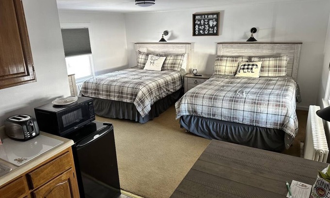 Very spacious room with two queen beds and a small kitchenette. A walk distance from one of our best restaurants and a short drive from our small town with all our shops and business’s. A small table with a fridge microwave and toaster.