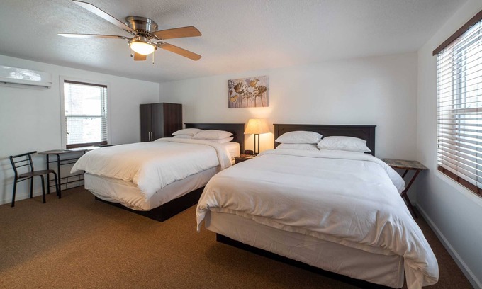 Room 3 at Inland in a Studio-Style with 2 Queen Beds. A small table and chairs provide the perfect laptop work space. This room has a hot plate, microwave oven and toaster oven for limited cooking. Cookware, dishes, silverware and some limited utensils are provided. The room also has a coffee pot, coffee, creamer and sugar are included. A small refrigerator/freezer is available for use. A tub/shower combo complete this room nicely. Perfect for limited or long-term rental.
