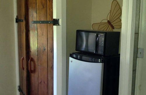 Room #3 has 1 Queen bed, private bathroom, and satellite TV. We offer a free continental style breakfast. Free self serve coffee and tea is available in the main lounge at all times. A hearty home-cooked breakfast is available for an additional $20 per plate. We allow well mannered pets. An additional pet fee of $24 per night per pet applies. Guests have access to the wireless internet, the shared kitchen, the BBQ, the out-door hot tub, the fire pit with complimentary fire-wood, the covered porch, the patio and surrounding gardens, the the main lounge with the wood stove with wrap around couch. Please note that this room has fans and is not air conditioned.