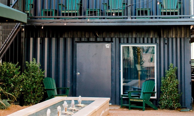 The Middleton is a boutique hotel featuring 16 rooms created on a historic property with modern construction and design elements. Utilizing shipping containers, each room has an upscale vibe with original artwork from all over the world. The courtyard features outdoor seating with food service, a fountain and balcony overlooking the downtown square. The adjacent bar serves signature cocktails, wine and craft beer in a classic yet sophisticated setting.