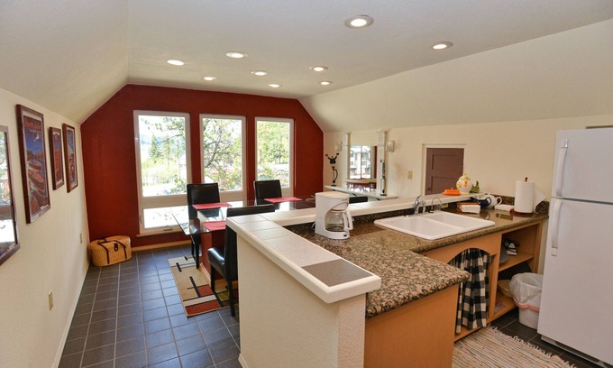 Head up the steps and walkway to use the private side entrance to this bright one bedroom, one bath vacation rental and head up the stairs to unpack. At the top of the stairs you will arrive into the sitting area equipped with a library of books to enjoy. The full bath with soaking tub and shower is accessed here as well. Your fully stocked kitchen and dining area are next with a large glass dining table for four and breathtaking views of Payette Lake.