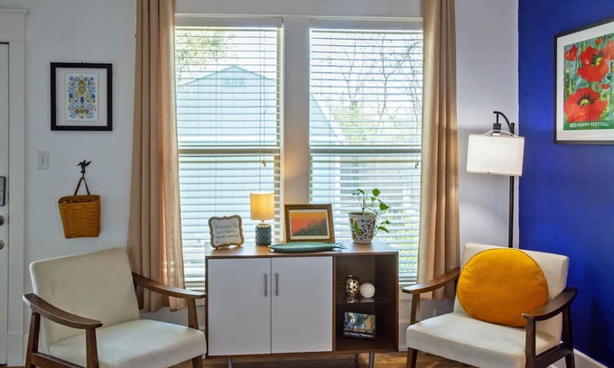 Private parking lot and private entrance to a room in the back of an adorable bungalow. Queen sized bed, mcm chairs with a smart TV for relaxing when you are not on the beautiful square. No available kitchen but a fridge, microwave and coffee maker for your convenience. Bathroom has a beautiful walk in shower and double sinks. This property is a 10 min walk to the beautiful square. Five minute walk to Southwestern University. There is a cute neighborhood coffee shop that is a 5 min walk called 309 Coffee. Dogs are welcome, only one pet per visit, fenced yard for them to enjoy as well as a fire pit. Come and enjoy all that Georgetown has to offer at an affordable rate!