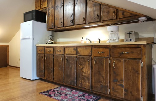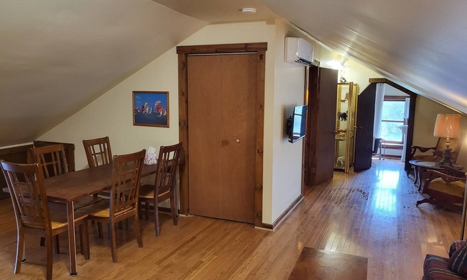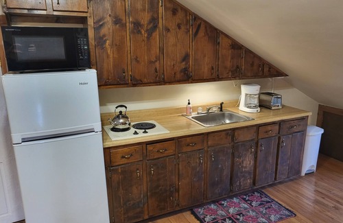 Welcome to the Farmers Suite on the 3rd floor of the Manor House! The Farmer's Suite is very private, situated with a bedroom with a full size bed, a comfortable sofa bed in the great room and affords views in three directions of the farm. With modern heating and air conditioning, an adorable claw-foot tub/shower, and a kitchenette with appliances the Suite is comfortable and charming. There are headroom limitations so this Suite is not for the super tall!