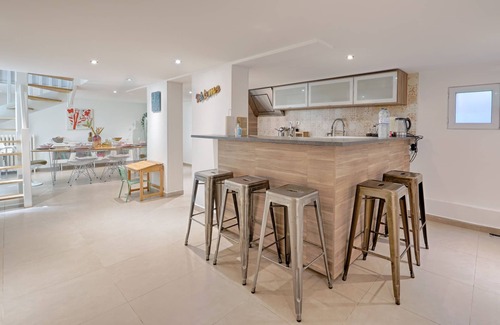 - Dining area with open kitchen equipped with electric kettle, oven, microwave, toaster, hob...