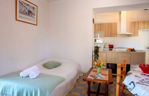 "Rose-May", 2-room house 40 m2, west facing position. Simple furnishings: living/dining room with 1 double sofabed (1 x 140 cm, length 190 cm), TV (flat screen). Exit to the garden. 1 room with 1 french bed (1 x 140 cm, length 190 cm). Open kitchen (oven, 4 gas rings, toaster, kettle, microwave, electric coffee machine). Shower/WC. Electric heating. Small garden 30 m2, east facing position. Terrace furniture, barbecue. View of the sea. Facilities: washing machine, iron, hair dryer. Internet (WiFi, extra). Parking (fenced 2 cars). Please note: non-smoking house. 1 small pet/ dog allowed. Smoke alarm. Offer by a private individual according to Art. 155, IV of CGI. 44012000167LP