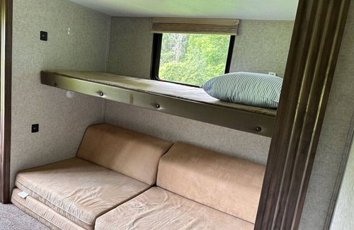 This 5 bed camper features a firepit sitting area outside.