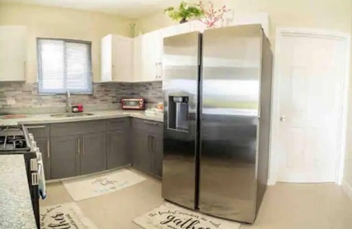 This modern home is fully equipped with all you would need for a relaxing vacation. The living room has a >58" smart TV and local cable, with an open concept dining room area that seats 6 and a dedicated work area with a 22" computer monitor (internet speed 250mbp), compatible with HDMI and VGA connections, which flows into the kitchen that has a Samsung gas range, a microwave, electric kettle, toaster oven, coffee maker and a side-by-side Samsung refrigerator. This home is suited for family with kids, remote workers and persons just wanting to relax alone. Each bedroom has its own bathroom. The backyard is fenced and private with tables and chairs.