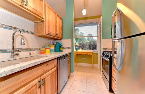 I LOVE ROYS PLACE! Romantic 800 sq. ft. boutique villa apartment. Only property in urban Sarasota with totally private (all yours, not shared) clothing optional heated pool.. Tropical Chic décor, quality furnishings, lush tropical landscaping. One block walk to beautiful sunsets over Sarasota Bay. All tropical serenity yet close to everything. Alternative lifestyle friendly allows you the freedom to totally be yourself many miles from your home town. Have fun creating new memories. One block walk to beautiful sunsets over Sarasota Bay. You will appreciate the quality, cleanliness and charm of this villa apartment. You can choose between cooking in the well equipped kitchen or dining al fresco in your pool side lanai. Shower under the stars in the special outdoor bamboo shower. The lush landscaping makes Roys Place an urban jungle. A short one block stroll will reward you with wonderful sunsets at our humble bay front park where local neighbors gather to chat and drink wine. You will have access to: Fully fenced back yard (very private), covered lanai, pool, grill, off street parking, laundry. This is a rare for Sarasota, jogging, bike friendly neighborhood with an excellent access along the waterfront where you will enjoy 100 year old oak trees, Spanish moss, modest houses to mansions and the beautiful Ringling Museum. Downtown Main St. Sarasota is a 5 minutes drive with over 100 restaurants, night life and shopping. The sugar white sand of Lido Beach is a short 10 minute drive. Staying in the Indian Beach neighborhood is truly Old Florida. Safe, quiet and friendly. Houses are an eclectic mix of modern to over 100 years old. There are three colleges in this neighborhood, a word class museum, micro-brew pub, Starbucks and a local restaurant in walking distance. The tiny yet beautiful bay front park is a one block walk. Sarasota is mainly a car reliant city. However, the public bus stop is a two block walk. SRQ airport is a ten minute drive. Complimentary beach chairs on property. PLEASE NOTE: OCCUPANCY IS LIMITED TO MAXIMUM TWO GUESTS. ADULTS ONLY PROPERTY (21+)