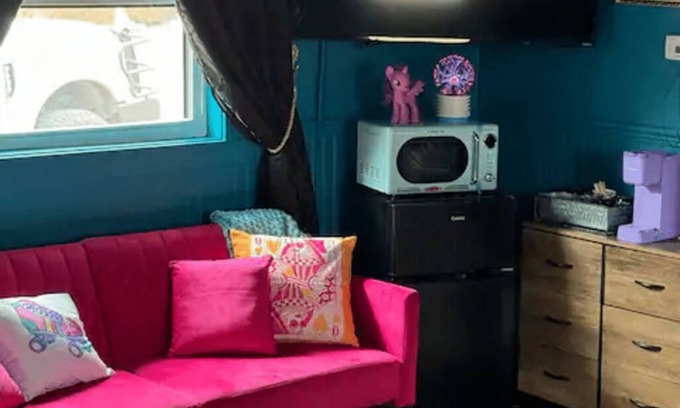 Get ready for a blast from the past at our totally rad 1980s-themed cabin! Step into this vibrant space and soak in all the nostalgic vibes. The cabin is decked out with authentic 80s treasures: relax in a Beetlejuice-inspired chair, admire the Purple Rain poster on the wall, and relive the adventure with Ghostbusters memorabilia. You’ll also find hair band collectibles, a classic boom box with a collection of 80s tapes, and neon decor that adds that perfect retro glow. Embrace your inner child with He-Man figure, My Little Pony collectible, and make prank calls on the iconic Garfield phone. Reminisce about the days of roller skating or check out the Gremlins lunchbox and Back to the Future die-cast model. For horror fans, there are also Friday the 13th items to add a touch of 80s thrill. Whether you're an 80s kid or just love the retro style, this cabin is a righteous getaway that will take you back in time! Additional amenities include WiFi, a TV with Roku, coffee service, a mini-fridge, a microwave, a ceiling fan, a window air conditioner, and complimentary toiletries (soap, lotion, shampoo, conditioner) for your convenience.