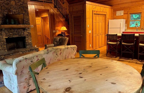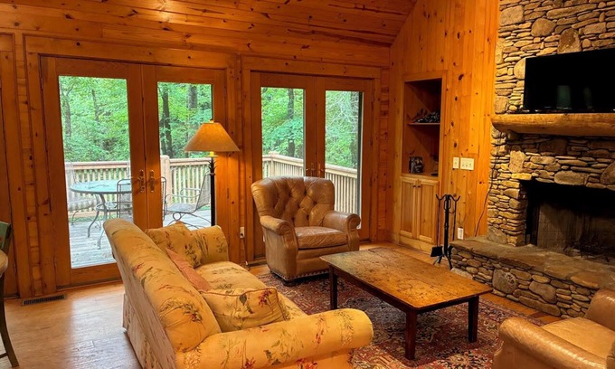 The custom-built cottage sleeps up to 6 people. It boasts a stacked rock wood-burning fireplace in the main living area, perfect for a fireside chat or cozy, cool evenings. The open floor plan has an equipped kitchen, countertop seating, a dining table, and a comfortable living space under the vaulted ceiling. The open-air deck and patio beckon you to commune with nature as you enjoy morning coffee among the trees.