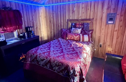 Enjoy yourself in the Ruby Kush Cabin with a comfortable bed and Ruby colored bedding. Get set to binge watch your favorite shows on the Smart Tv with theater sound. Bluetooth your playlist and vibe in the glow of LED lighting and just refuel your soul. The Ruby Kush cabin has air conditioning, refrigerator, microwave, Ninja Coffee maker , coffee, coffee cream, Wi-Fi, soft drinks and a big bowl of munchies. There’s an outdoor portable toilet located next to the cabin. All on tree shaded campground near Michigan International Speedway. Cannabis friendly.