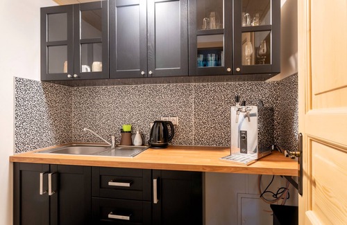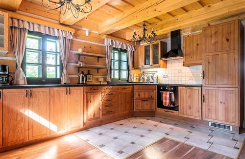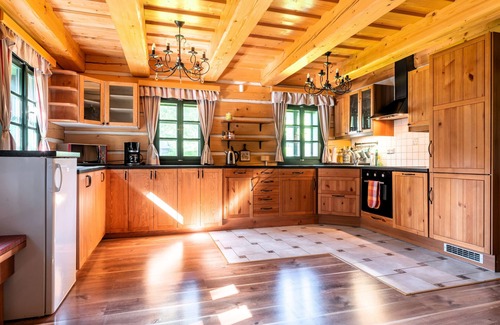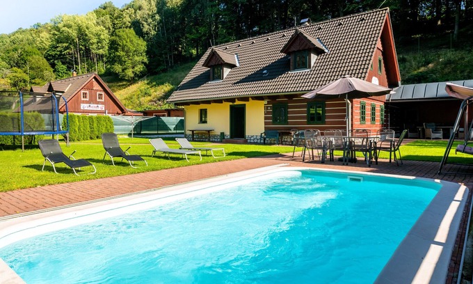 Charming villa in woods and mountains. This attractive, recently renovated and quiet wellness villa is located in the wooded area of Rudnik and can accommodate up to 14 people. Surrounded by the greenery of both the surrounding forest and a beautiful garden, this accommodation has everything you need to relax.This holiday home is tastefully and completely furnished and with three bathrooms (two with a bath) and five toilets, you certainly don't have to get in each other's way. The kitchen is suitable for preparing delicious meals. With a refrigerator, freezer, oven, microwave, kettle, coffee maker and kitchen utensils you are fully equipped. You don't have to worry about dirty dishes. The dishwasher takes care of this. This villa is also ideal with children. In the garden there is a nice children's play area with, among other things, a slide, swings and a wooden climbing structure and there is also a table tennis table available. The private swimming pool (6 by 3 meters; maximum 1.20 meters deep) guarantees lots of fun. While the little ones are having so much fun, you as a parent can enjoy a drink in the garden, by the pool or at the specially built outdoor fireplace with BBQ. The villa also has a new beer tap installation. A beer keg can be arranged (in consultation with the owner).As icing on the cake, there is a new jacuzzi (for 4 people) and a sauna (for 5 people). Sauna sheets, towels and hair dryers are a matter of course here. Perfect relaxation during your holiday is certainly guaranteed.The charming mountain village of Rudnik is located in a picturesque area characterized by mountains, forests and splashing streams. It is therefore fantastic hiking here. From the Sněžka, the highest peak of the Giant Mountains, you have a magnificent view over the Czech Republic and Poland. Is walking difficult? Then you just take the elevator! Furthermore, it is, for example, a fifteen minute drive to Vrchlabí, the 'gateway' to the Giant Mountains, and less than half an hour to the famous spa town of Janské Lázně.