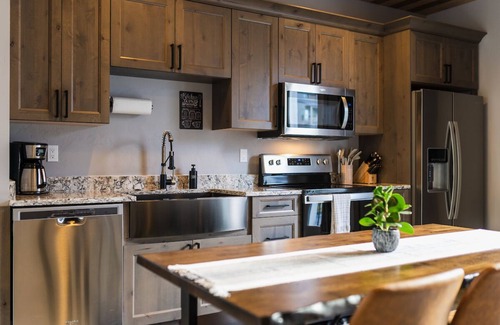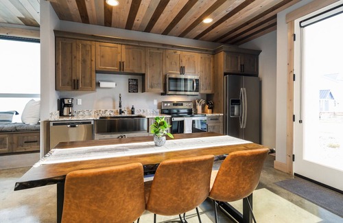 Continuing through the home, you will see a large live-edge wooden dining table to accommodate all your guests, with brand new appliances, custom wood cabinets, and a large farmhouse sink. You will find a coffee bar in the pantry with options for drip, Keurig, French press-style coffee, and an electric tea kettle. There is ample storage for food and wine that you pick up during your stay. Completing the downstairs is a bathroom with a shower and a laundry closet with a full washer and dryer.