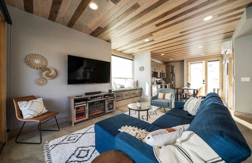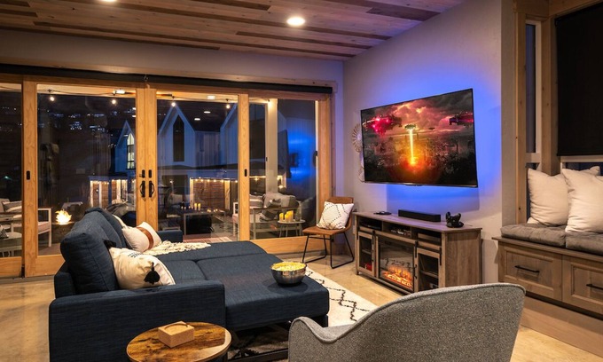 Next, enter through grand sliding glass doors from the back patio into a rustic living room with wood paneling on the ceiling. Cozy up on the couch with the remote-controlled fireplace and enjoy immersive streaming options on the 65” 4K UltraLED smart TV. Easily stream your content directly from your phone with the TV’s built-in G. Chromecast. Use the included Xbox One X or Blu-ray/DVD player for additional entertainment options and lower the blackout shades all around for a movie theatre experience!
