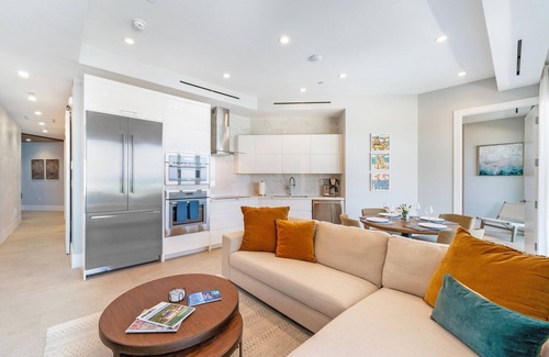The gourmet kitchens come equipped with a suite of Thermador appliances. Cookware, dishware, glassware, and cutlery are also provided. An outdoor dining table is furnished on each unit's private veranda for meals with sweeping oceanfront views. An indoor dining table is also furnished just off the kitchen area in each condo.