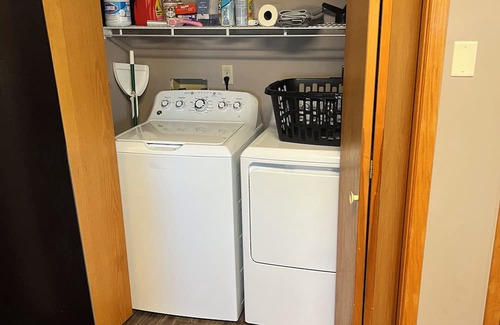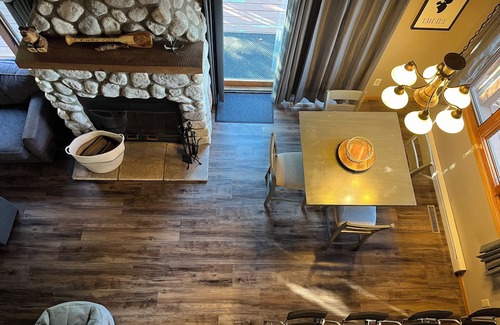 If you enter the home through the front door, you are on the main floor, or middle level. The main floor is where you will find a cozy living room with a breathtaking 18'+ stone fireplace, a fully equipped kitchen and dining space, BRAND NEW full-size washer and dryer (May 2024), Bedroom 1 (king bed) Bedroom 2 (queen bed), and full bathroom with walk-in shower.