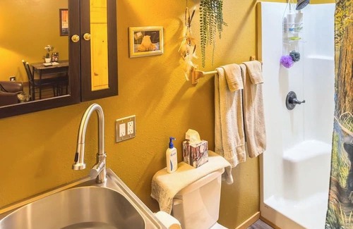 This tiny cabin sits up on a bluff (4WD/AWD is recommended) on seven acres of riverfront wilderness. Sharing the property with you are the local host, their two dogs (a golden Anatolian named Dixie and a border collie named Sugar), and beautiful horses (Princess, Buddy, and Cotton) whom you're welcome to meet. Spend your days enjoying the river, admiring the sweeping view, or taking a tour of the property with the local host if you're interested.