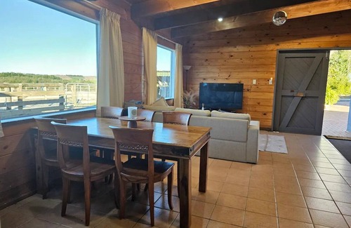 The kitchen, lounge and dining area is across the paved courtyard separate to the house and is private to your booking. This overlooks our horse arena with views out across the Waikato River and beyond.