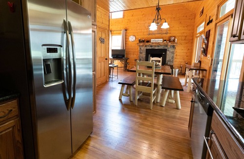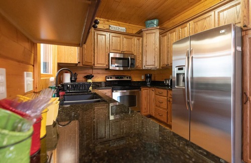 Rushing Creek Cabin features a master bedroom, furnished with a king-size bed plus, the master bath includes an oversized jetted tub. The second bedroom offers two- twin size beds and a second full bath. This beautiful cabin also includes a fully equipped kitchen, perfect for preparing your cozy homemade meals.