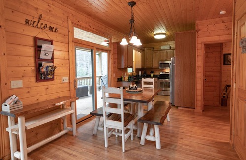 Rushing Creek Cabin is a beautiful, spacious two-bedroom, two-bath cabin that is located along the rushing creek and surrounded by luscious scenery. This secluded cabin features a woodburning fireplace in the comfortable living area, an outdoor grill, and outdoor fire pit where you can entertain your guests all while enjoying the sounds of the rushing creek from the back deck.