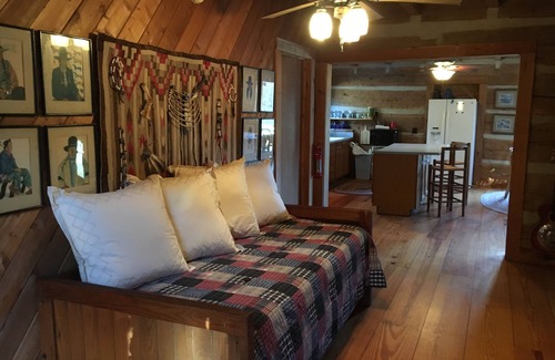 The cabin has a total of 9 beds. The upstairs consists of a master loft with queen bed and a separated bedroom that has a king, 3 twins, and 2 bunk beds. There is an additional bed down stairs with a trundle. The cabin sleeps 6 comfortably, but can accommodate up to 8. It is great place for family getaways, wedding accommodations, trips to the many local wineries, or a quiet retreat.