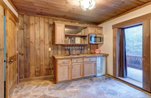 Mealtime is effortlessly elegant around the large dining table at Rushing Waters, perfect for breaking bread with friends and family as the beautiful chandelier sheds a new light on dinner. Celebrate your vacation with a bottle or two of wine, which you can keep chilled in the convenient wine cooler.