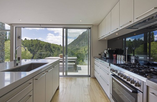 Riverview Retreat contains four double bedrooms and two and a half bathrooms. It has 2 living areas, each boasting a large gas fireplace and spectacular views of the Shotover River and mountain ranges. There is a brand new fully equipped kitchen, including a coffee machine. There is plenty of space to host one or two families or a group of friends travelling together.