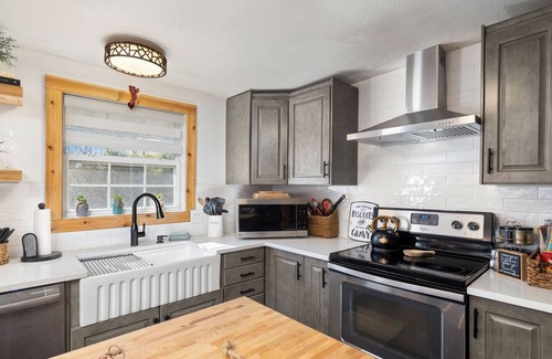 Kitchen remodeled with brand new cabinets with quartz countertops, ceramic farmhouse sink, antique butcher’s black island for food prep! We stock our kitchen complete with spices, starter oil, grilling utensils, all normal appliances including blender, crock pot, mixers, baking pans (muffin and cookie sheets) pots and pans. All you need to bring is your groceries!