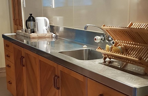 The bathroom is a unique open "camping style" room attached to the lounge/kitchen block containing two toilets and two "wet floor" showers.