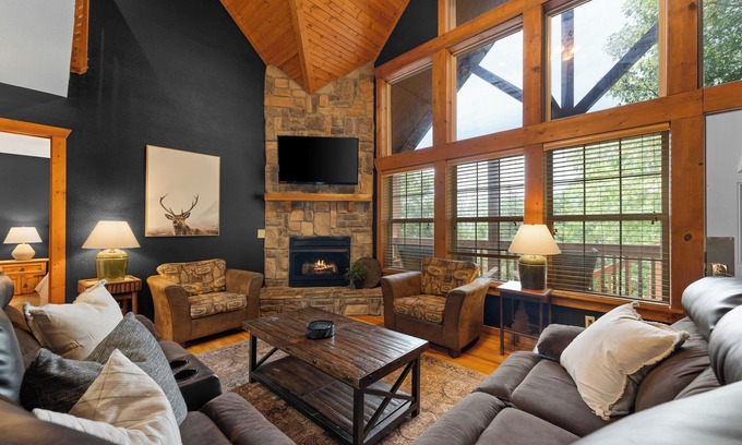 Step right into this rustic retreat and enjoy a few days immersed in the woods. This two-story wood cabin is located in StoneBridge Village just minutes from Silver Dollar City and offers everything you would need for a relaxing getaway! Four bedrooms and four attached bathrooms means everyone gets their own privacy and the woodsy ambiance of surrounding trees creates a peaceful atmosphere for all in your group! Branson's fun-filled adventures are only 10-20 minutes away and are sure to offer a vacation full of memories!!