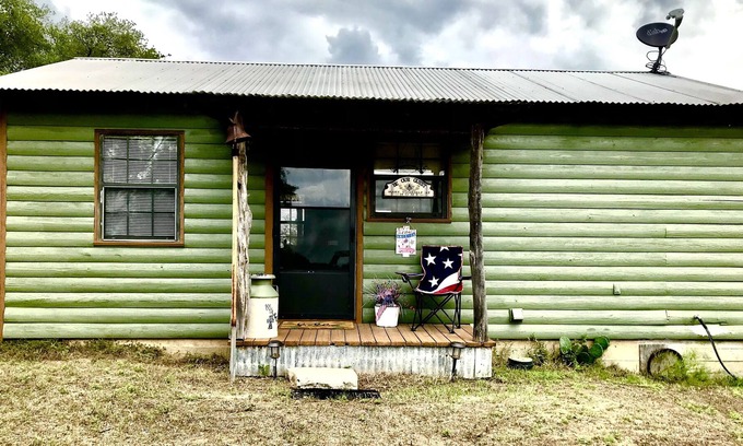 Private country setting, rustic cabin on 20 acres shared with momma llama and cows. With windmill and pond makes it great for exploring or a peaceful sunset from the porch. Food and shops within 15 mins.