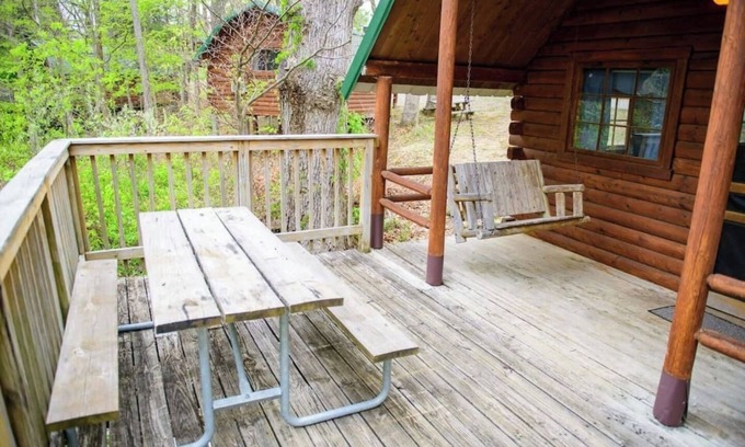 This cabin comes with the convenience of a bathroom that is equipped with a toilet and sink, ensuring that you have everything you need for a comfortable stay. Showers are available on-site in the campground bathhouse.