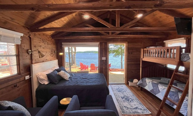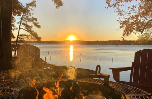 Sit back and relax in this calm, stylish space. Sip coffee on the covered porch and take in the beautiful sunrise on your lakefront view surrounded by Sabine National Forest. Keep an eye out for Bald Eagles, and an Osprey nest atop a 20 ft high tree stump just a quarter mile from shore. Explore nearby coves from our kayaks, jump in the lake from our swimming platform, fish from our piers, or lounge by the campfire. The cabin is inside Mid Lake Campground located on Toledo Bend Lake, one of the premier bass fishing lakes in the country, and we have the best crappie fishing on the lake right below our marina just steps away. Be sure to check out our other lodging options for cabins and larger groups as well.