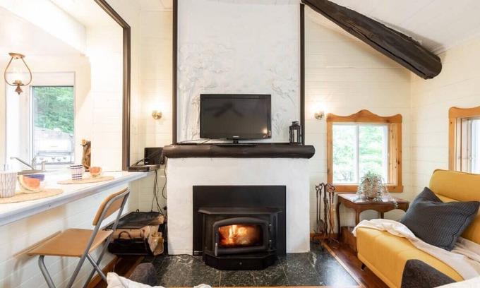 On the main floor, the fully equipped kitchen invites you to cook delicious meals, while the living room welcomes you with a crackling fireplace—perfect for cozy moments.