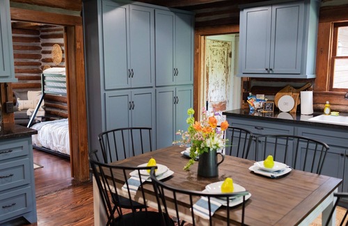 The Crawford Cabin is a truly unique experience in travel and leisure. This historic 100-year old log cabin offers a living area, two bedrooms, a full kitchen and bath, plus its own private outdoor hot tub. Fully restored, the Crawford Cabin retains its original log walls and wood floor, and has been fully updated with AC and heat, modern appliances, and indoor bathroom. With its rustic charm and modern comforts, the Crawford Cabin is a one-of-a-kind experience.