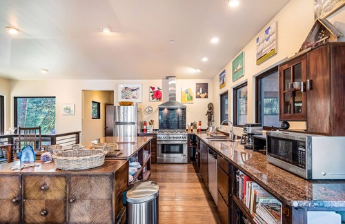 The guest house also is simple and functional, with red oak floors and granite kitchen countertops and furnished with a similar uncluttered Asian-influenced esthetic. The large great room has the kitchen, dining, socializing and twin beds. Completing the main floor is the master bedroom with a queen bed under a Javanese wall carving, and the recently-remodeled bathroom with private forest views. The basement affords access to the main floor and the washer and dryer.