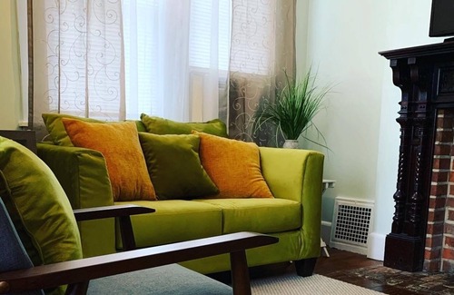 The home is furnished with one queen-size bed in bedroom 1, one full-size memory foam bed in bedroom 2 and one full-sized sleeper sofa in the rear sunroom (a semi-private room not connected to the main living room). (We'll let you draw straws to decide who is sleeping where—ha!) The optimal number of guests would be 1-6 people. But we can definitely fit 8 if you're willing to squeeze and sleep on the mid-century modern couch!
