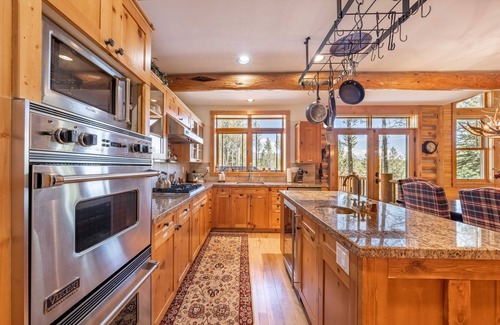 Located in Cottonwood Creek Canyon, The Kicking Bear matches the standard of luxury accommodation with a Western motif unique to Jackson Hole. The area is often visited by wildlife. Our home's forested location gives its guests an escape into a mountain wonderland and lets them live their log cabin dreams to the fullest. The log walls and vaulted ceilings immerse you into the calm of nature. The two levels lets friends and family spread out into the home's four bedrooms.
