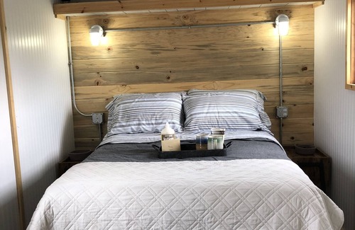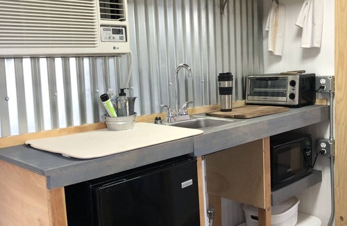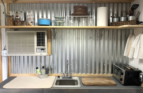 Our rustic farmy little casita (approx. 180 sq. ft) boasts a custom build interior with brand new everything inside. Super cozy and comfy! Fairly forewarned, the shower is small. It is tiled, has a rain-head and on demand hot water but it is small. Most guests love the property so much they don’t mind.