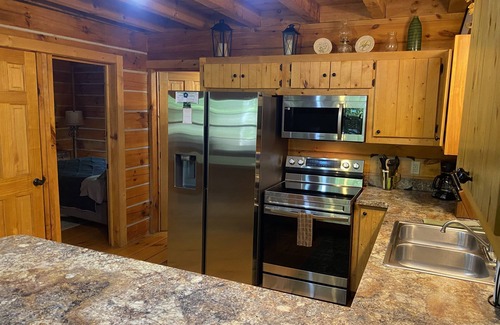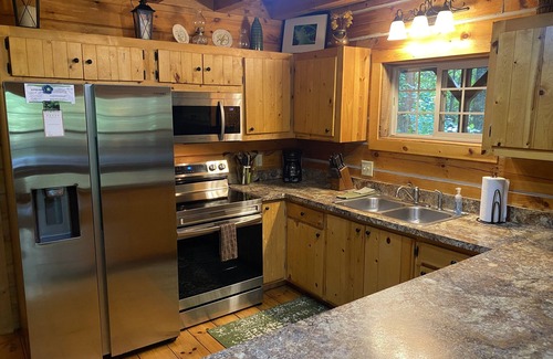 This cabin is designed for comfort and enjoyment, featuring a cozy wood-burning fireplace, a spacious kitchen, vaulted ceilings, and a Flat screen HDTV with Satellite for entertainment. Revel in modern aesthetics with updated decor throughout.