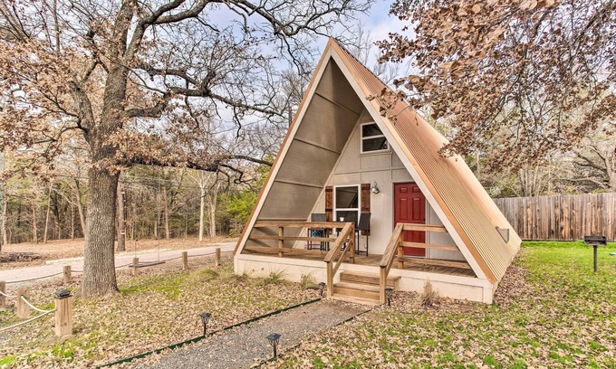 Find your bliss in the peaceful setting of this cozy 1-bedroom, 1-bath Gordonville vacation rental. This 2-story cabin — with a well-stocked kitchenette, a shared fire pit, and additional vacation rentals on-site for large groups — will be an ideal launching point for lakeside escapades. Trailblaze through Shady Park, venture along the Cross Timbers hiking trail, hit the waters of Lake Texoma with Captain Marty's Fishing Guides, or try your luck at Megastar Casino. Exploration awaits!