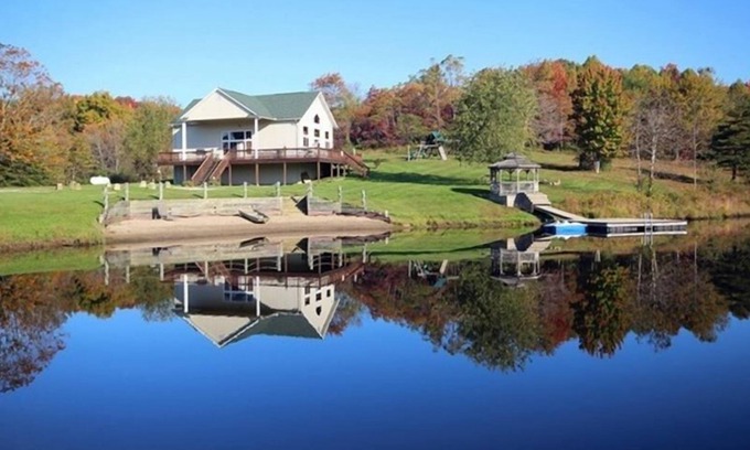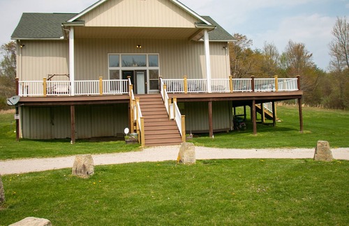 # Originally built as a barn in the 1800's, this adventure lodge has been fully restored down to the finest detail, with the original barn beams and wooden interior remaining just as they were back in the frontier days. Lodge on the Lake sleeps 12 in beds and sits on 20 private acres with something to offer every sportsmen or recreationist. Enjoy the private spring-fed lake stocked with bass, catfish, bluegill and trout. Kayaks are tethered to a dock that sits off a private beach with real sand. The Lodge is just a short walk from 200,000 acres of premier public hunting at Wayne National Forest. If you want more adventure, the Lodge is just 20 minutes from an amazing public ATV trail system (75miles!) at Dorr Run. All this plus the majestic scenic attractions of Hocking Hills! If you want to be an outdoors man (or just feel like one), yet enjoy modern amenities, Lodge on the Lake is perfect for you.