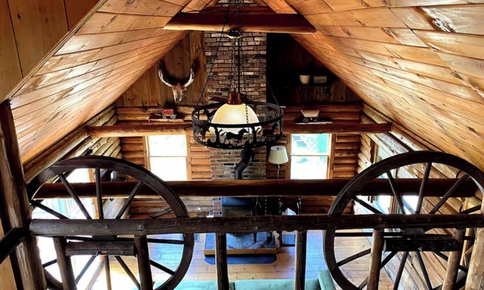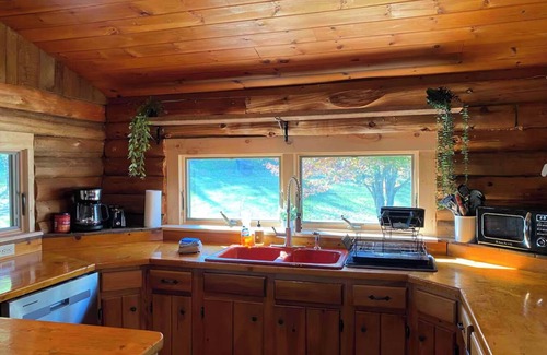 High ceilings, wood stove, mountain views and star-gazing: our rustic log cabin is the quintessential Vermont experience. The entire house and property are yours during your stay. This clean and tidy cabin has a large primary bedroom with a queen bed, as well as a loft sleeping area with a queen bed (NOTE: as a traditional loft, the space is above the living room, does not have a closing door, and is accessed via a ladder). There are two full bathrooms - one is off the primary bedroom and the other is downstairs - plus an upstairs water closet. The kitchen includes a nice assortment of cookware and utensils to prepare meals. You’ll love the huge, custom-made velvet couch and wood stove in the living room, the deck for eating meals or doing yoga, the outside fire pit and, of course, the hot tub.