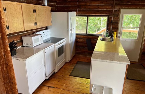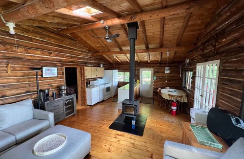 The property consists of a small 1960's log cabin where the kitchen, living room and a screened sitting area are located. This is all so where there is two bed rooms and a 2 piece private wash room. The two bed rooms have sliding barn doors and 3/4 height walls like would be found in period typical log cabins. Near the main cabin there is an outdoor shower lots of hot water and adequate privacy for you to enjoy how you wish. This is the only shower on the property which we find quite lovely and a really enjoy.